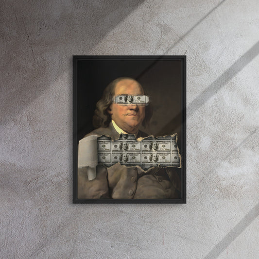 The Iconic Duo: Benjamin Franklin and the Bull of Wall Street Framed Canvas